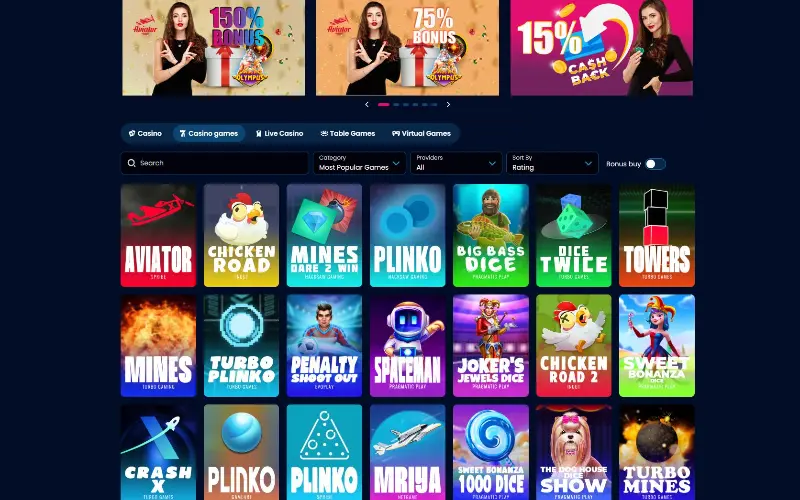 Sākumlapā uzreiz tiek izcelti piedāvājumi, bonusi un galvenās funkcijas. Galvenajā spēļu lapā ir redzami populāri nosaukumi, nesenie laimesti, labākie piegādātāji un skaidri organizēts visu pieejamo kategoriju saraksts.